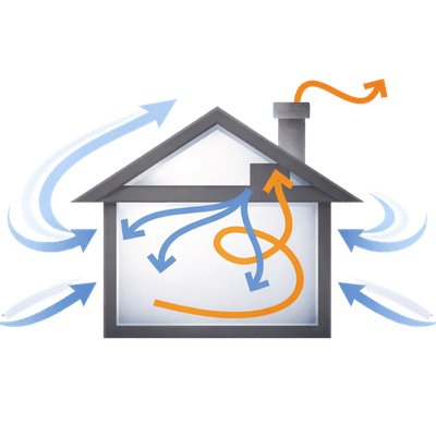Gaiss pārvietojas ārā no telpas, pateicoties gaisa temperatūru starpībai. Gaiss mājā kurināšanas laikā radītā zemākā spiediena dēļ izplūst un ieplūst caur nenoblīvētām sienu konstrukcijām, izraisot auksta gaisa plūsmas sajūtu telpās.